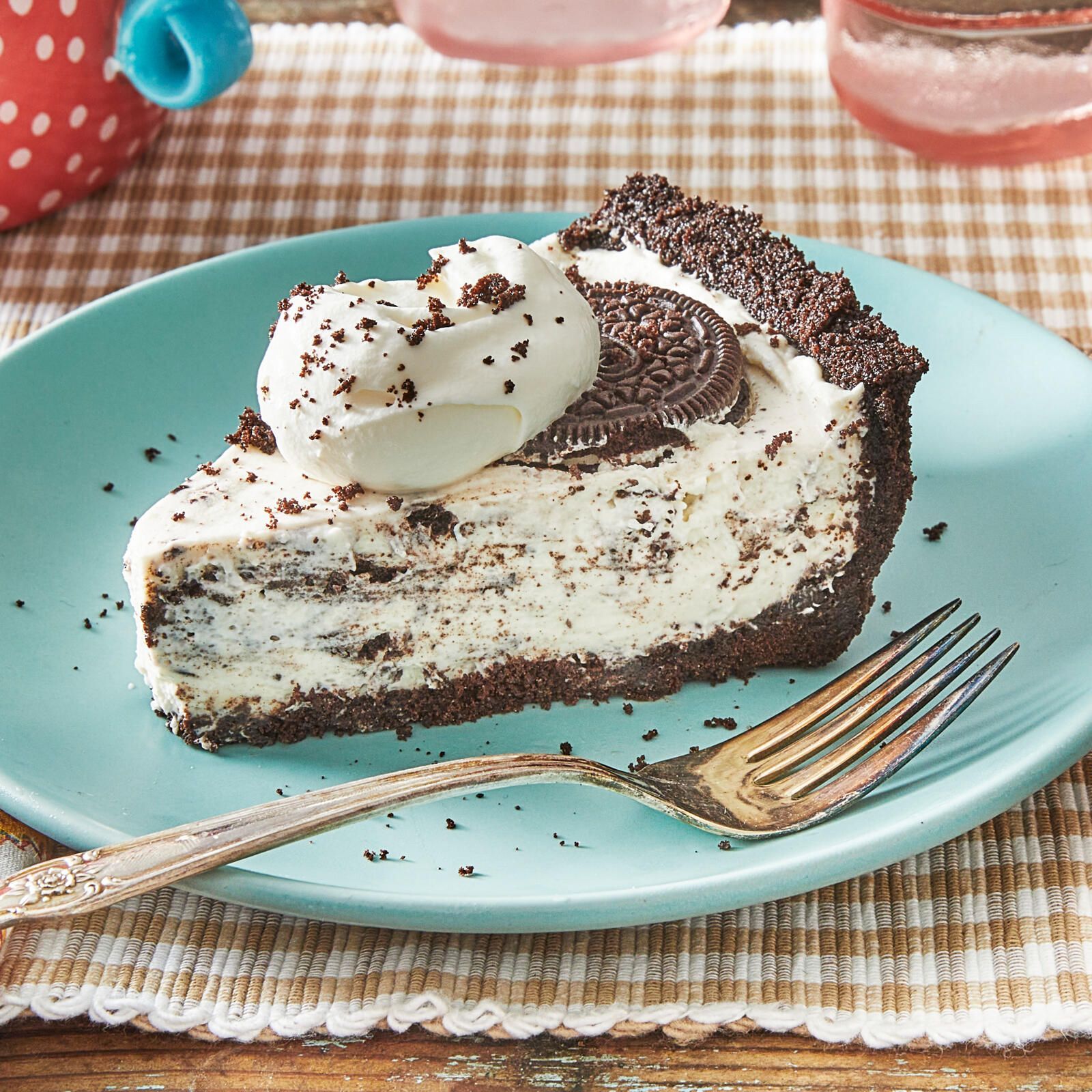 trae una capa de galleta oreo,una capa de mezcla, oreo triturada y lecherita